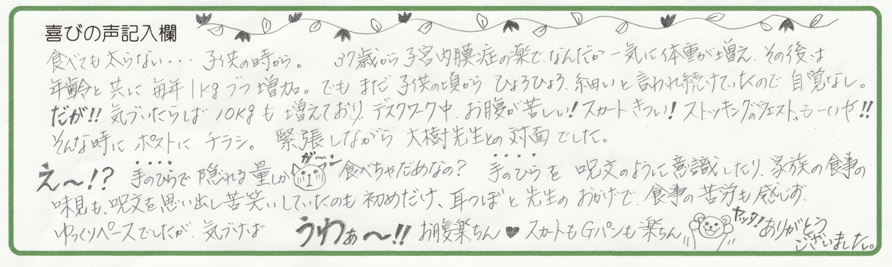 食べても太らない…子供の時から。37歳から子宮内膜症の薬で、なんだか一気に体重が増え、その後は年齢と共に毎年1kgづつ増加。でもまだ子供の頃から ひょろひょろ、細いと言われ続けていたので自覚なし。だが!!気づいたらば10kgも増えており、デスクワーク中、お腹が苦しい!スカートきつい!ストッキングの〝ウエスト〟もーいや!!そんな時にポストにチラシ。緊張しながら大樹先生との対面でした。え~!?手のひらで隠れる量しか食べちゃだめなの?手のひらを呪文のように意識したり、家族の食事の味見も、呪文を思い出し苦笑いしていたのも初めだけ、耳つぼと先生のおかげで、食事の苦労も感じず、ゆっくりペースでしたが、気づけばうわぁ~!!お腹楽ちん、スカートもGパンも楽ちん。ヤッタ!